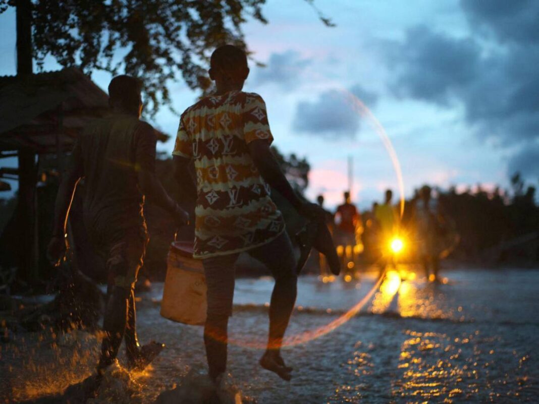 En el exterior, la gente camina en medio de la oscuridad entre las calles anegadas de Petit-Goâve